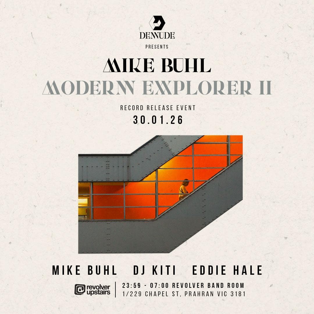 Following the success of the first Modern Explorer showcase, Denude returns to Revolver Upstairs with Mike Buhl for the launch of Modern Explorer II. The new EP extends Mike’s distinctive approach to techno — deep, patient and built for long-form club environments, with an emphasis on mood, movement and restraint.